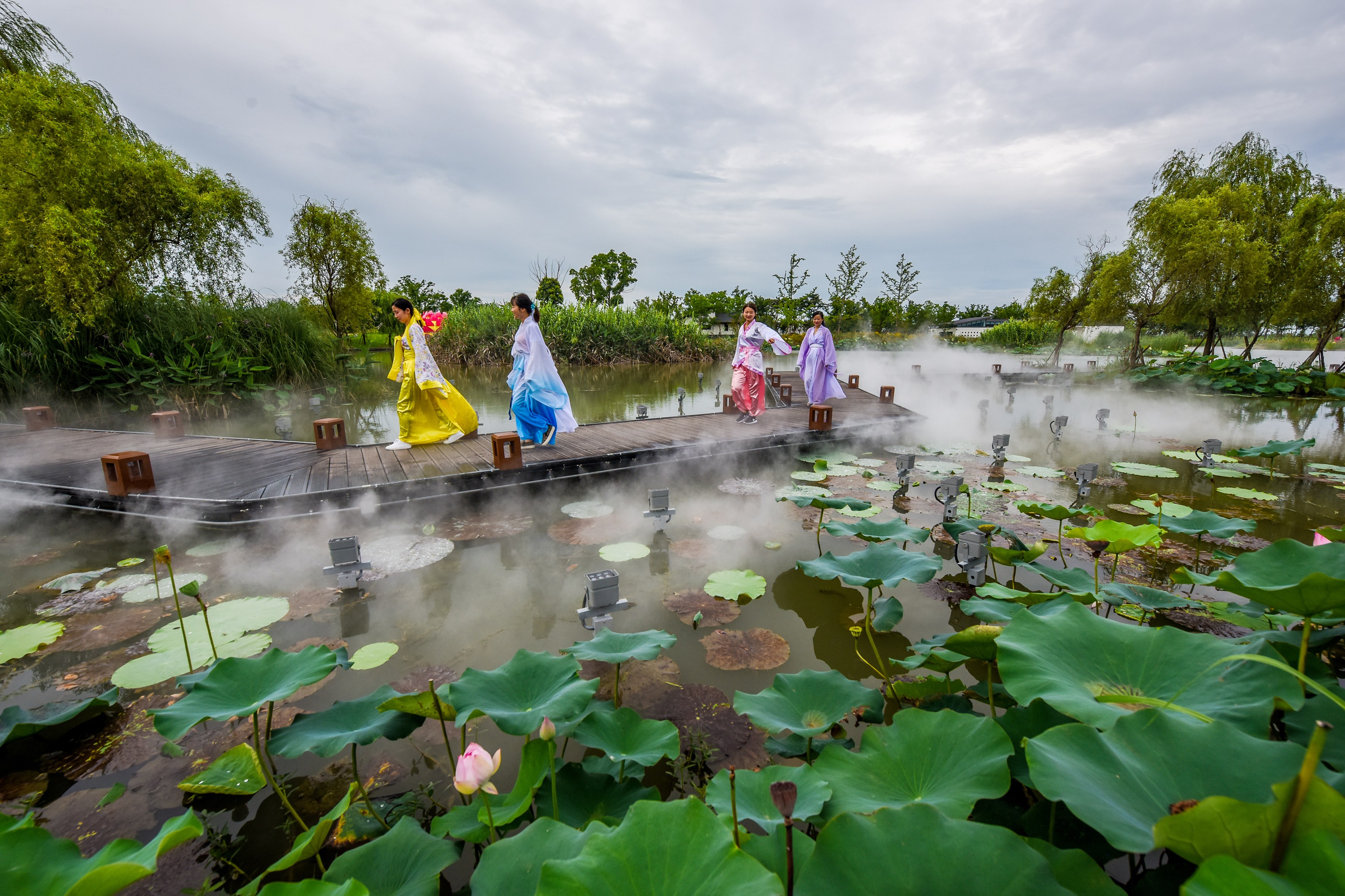 漫步百荷园木栈道,缥缈如烟,如临仙境;邂逅襦裙汉服女子,娴静温婉,长袖轻着。荷花节期间,水慢城推出“荷你心意”汉服秀活动,行走或穿游在百荷园内,都有机会邂逅汉服美女,着汉服入园则更享5折优惠。市民可在水慢城微信公众号上预约,并凭预约凭证到指定窗口换票即可入园。